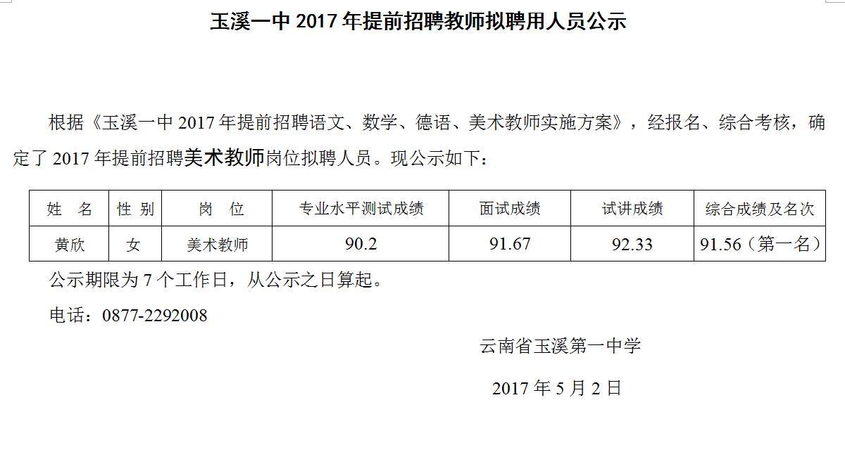 玉溪一中2017年提前招聘语文教师递补拟录用人员公示 2017-06-23